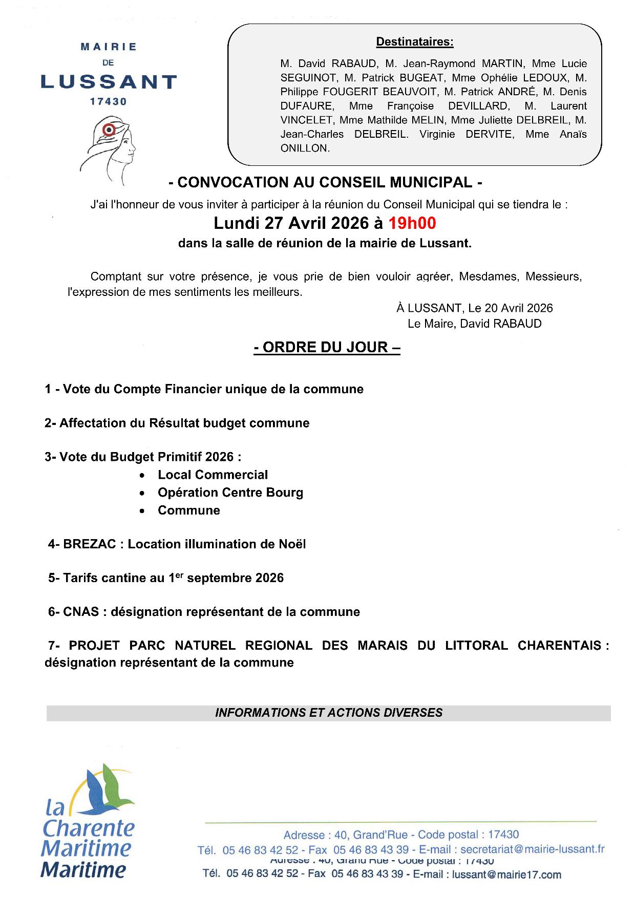 Conseil Municipal + Ajouter à mon Agenda Google + iCal / Outlook export 00 jours 00 heures 00 minutes 00 secondes Date 27 Avr 2026 Heure 19:00 - 21:00 Lieu Salle du conseil Mairie Organisateur Mairie de Lussant Téléphone 05 46 83 42 52 Email accueil@mairie-lussant.fr Partagez cet événement avril 2026 Avr 27 2026 Conseil Municipal Salle du conseil Pas d'événement actuellement programmé.